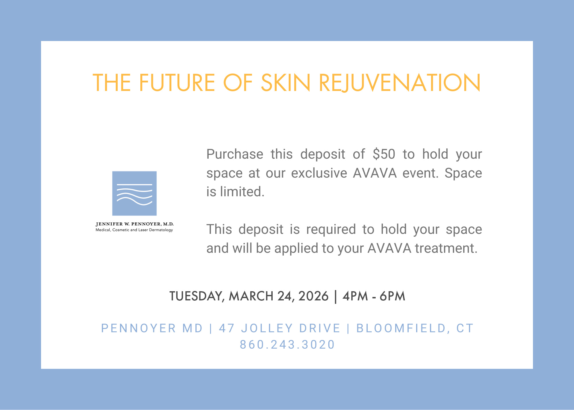 To reserve your spot at the event, a $50 reservation fee is required. This fee will be applied toward your Avava treatment at the time of your appointment.